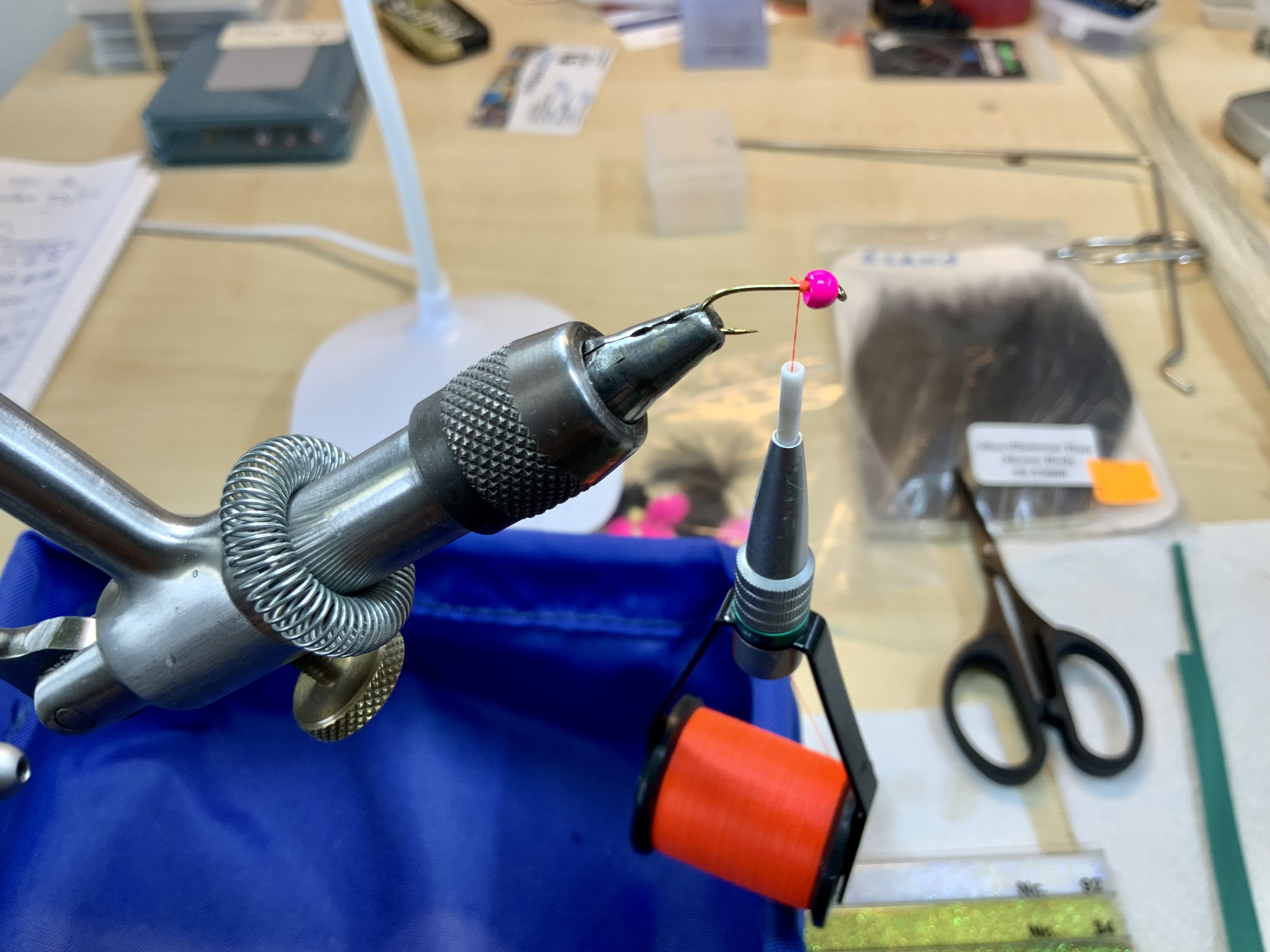 We binden het lijfje achter de kraal vast op de haaksteel waarbij we enkele mm strak om de haaksteel binden dit voor het hackeltje en de dubbing.