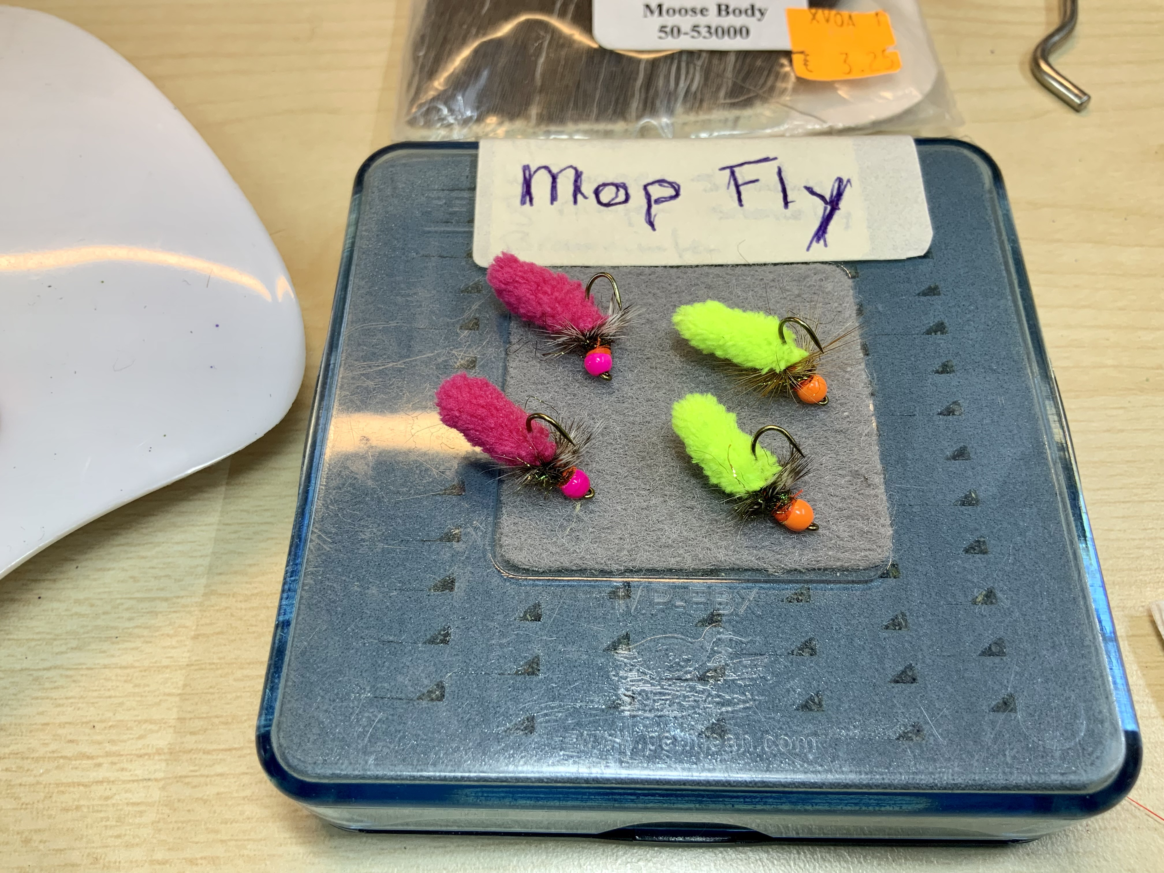 Deze vlieg kan in alle kleuren gemaakt worden van de uitsteeksels van een huishoudmop, een dweil waar de vloer mee gedweild wordt. Te koop voor weinig bij oa de Action.