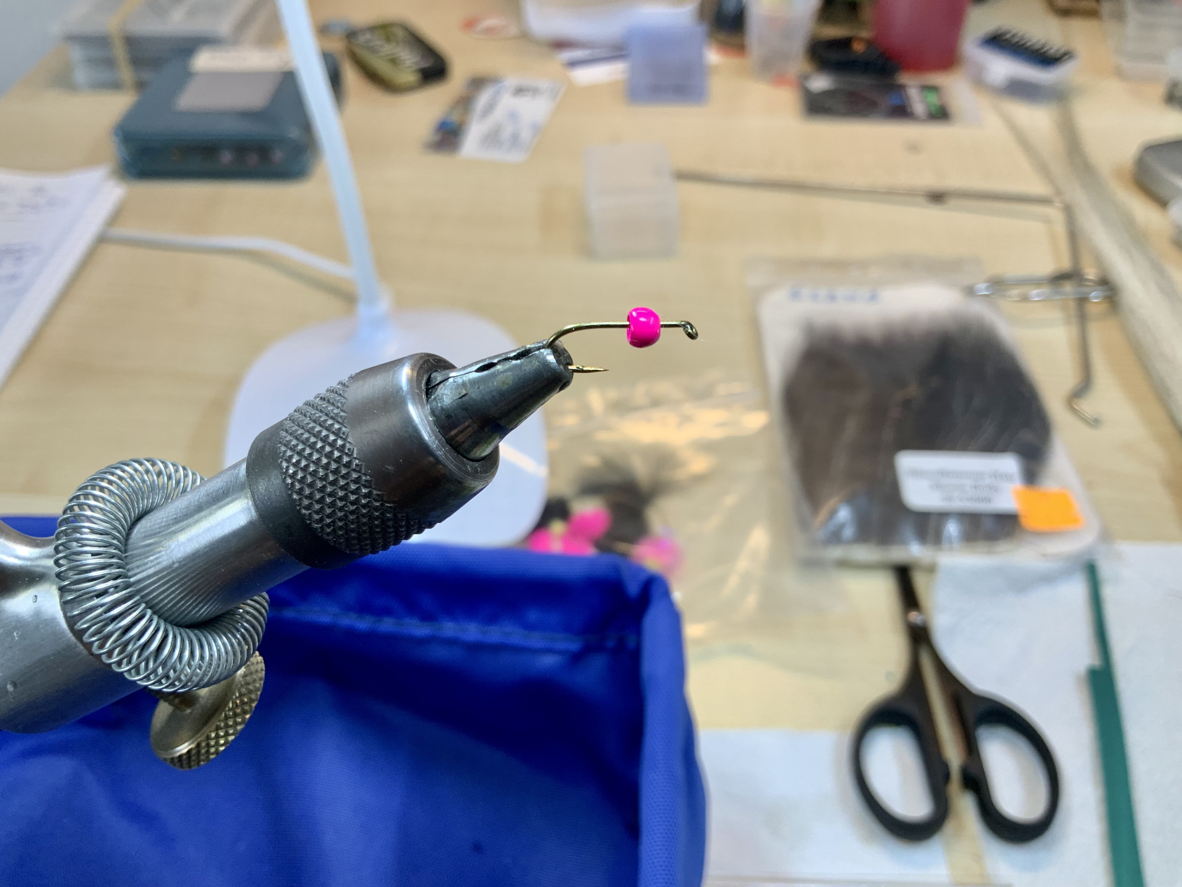 We knijpen de weerhaak plat, schuiven de kraal op de haak en zetten de haak in de vice: