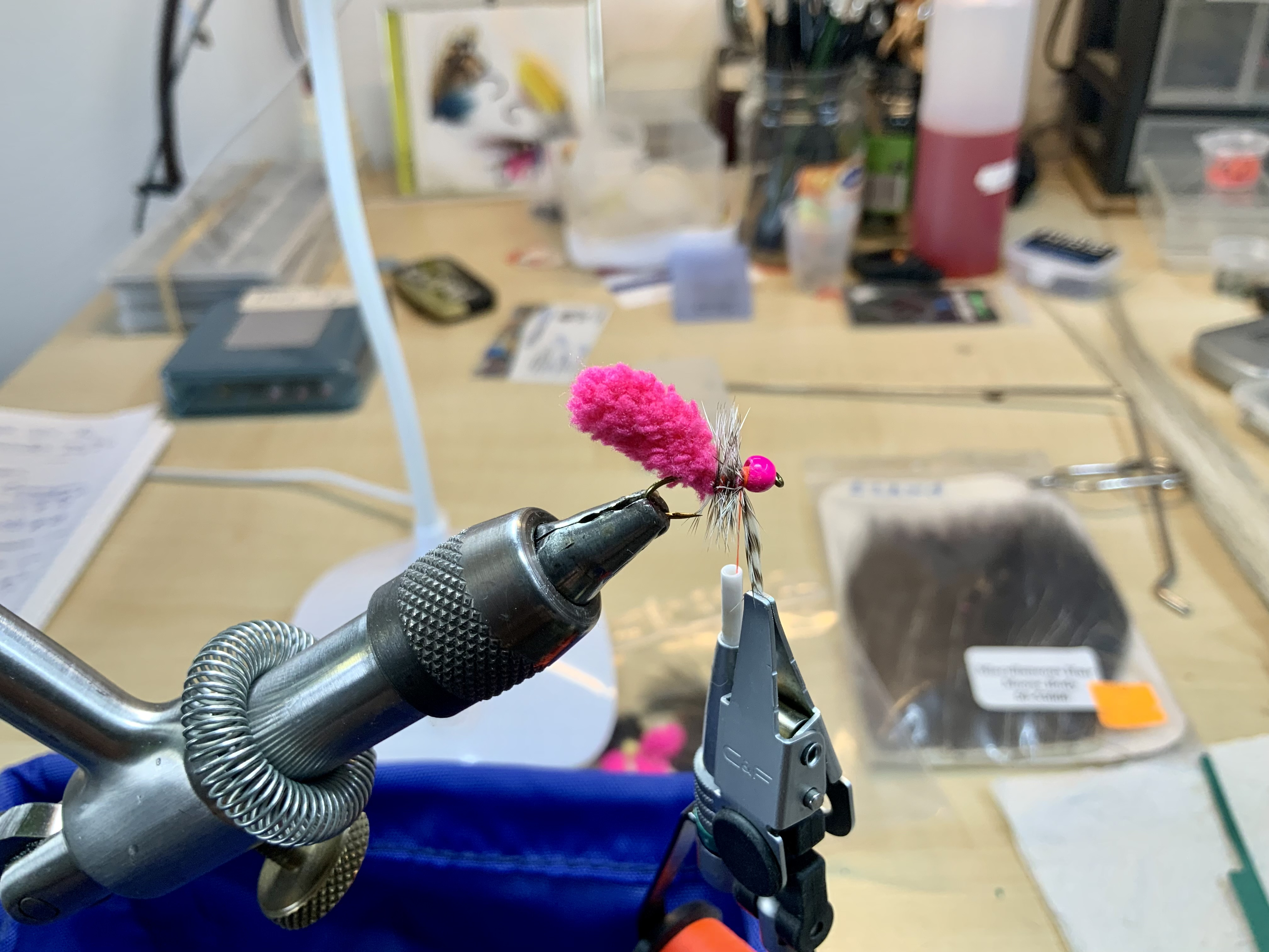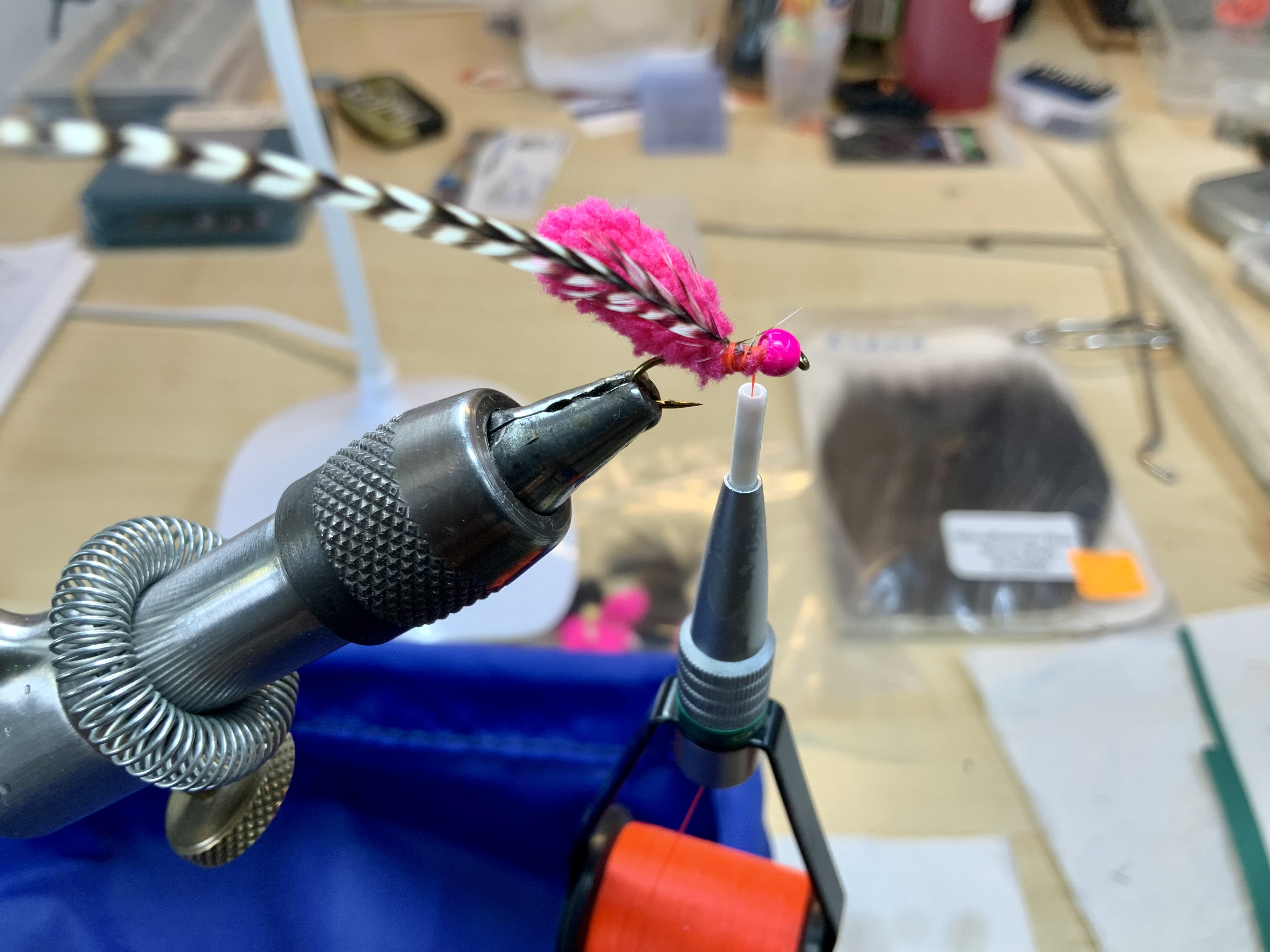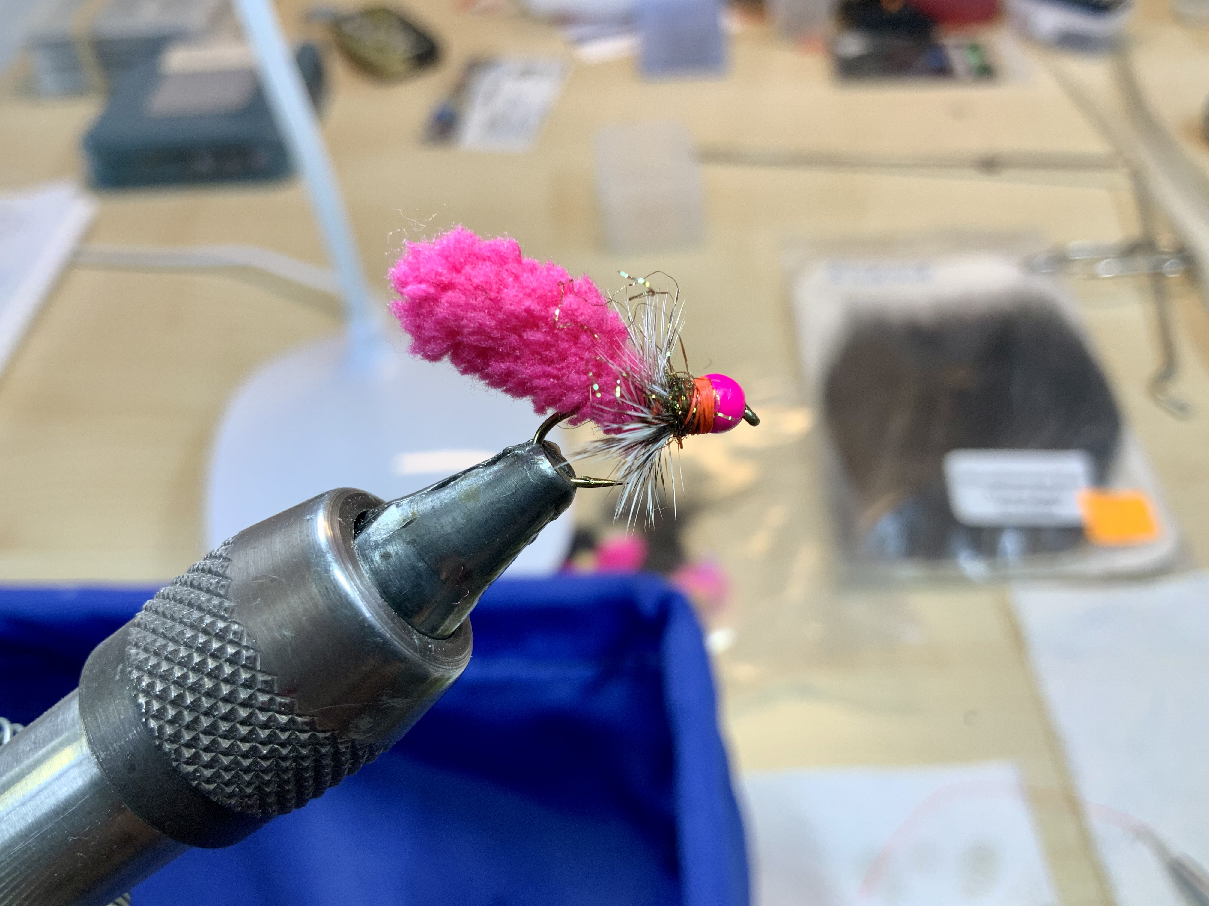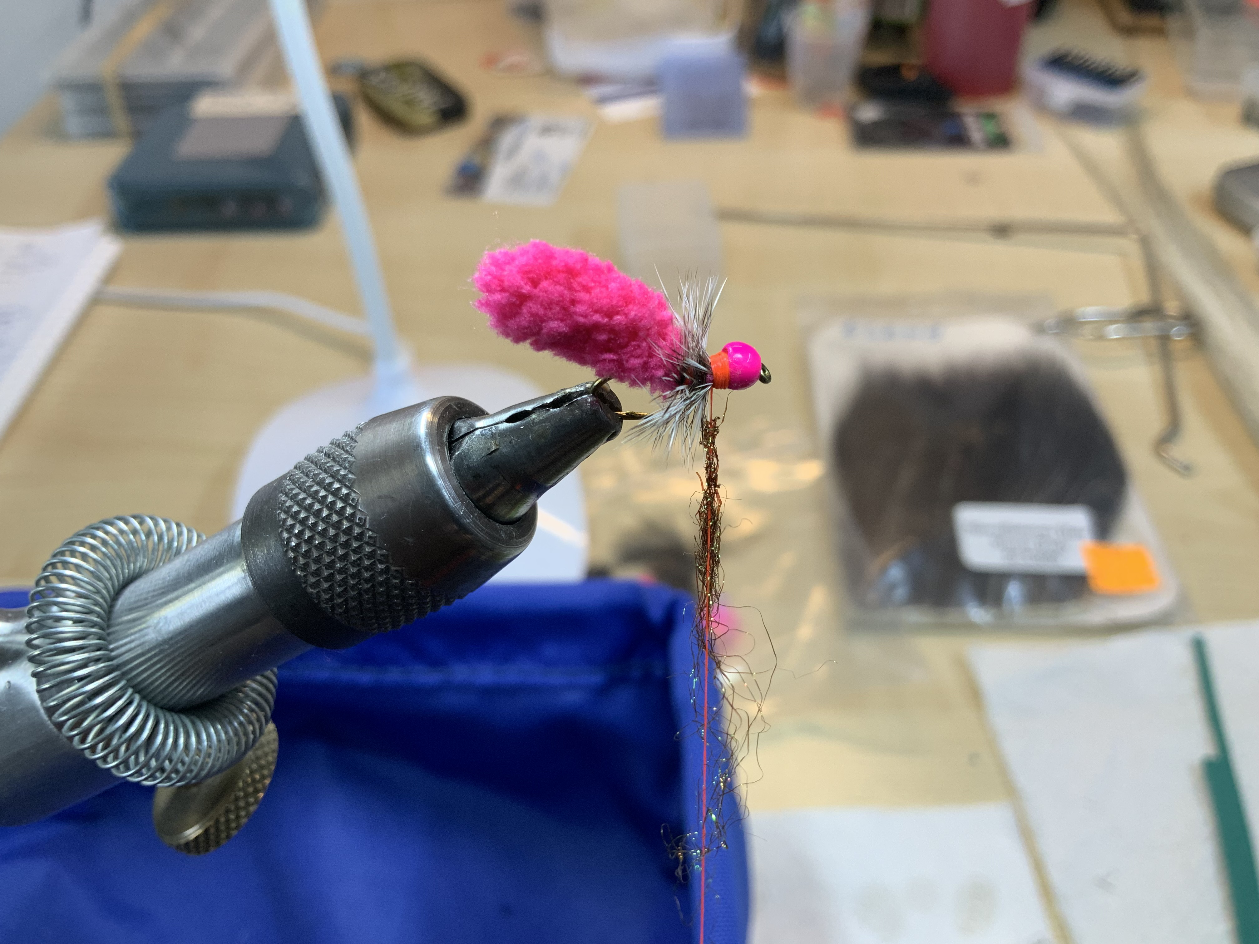Hierna wikkelen we een klein plukje Spectra dubbing achter de kraal voor de schittering van deze draadjes die dat teweeg kan brengen: