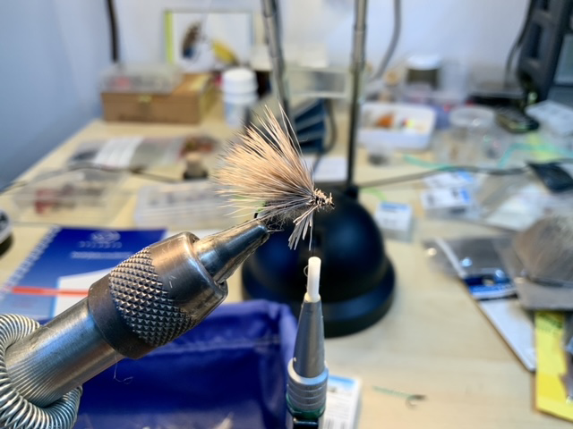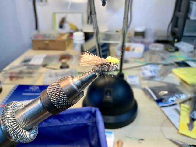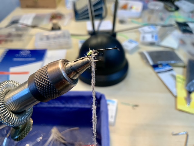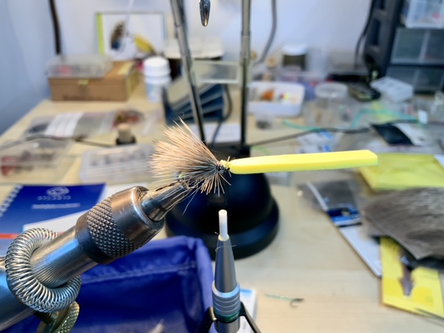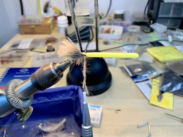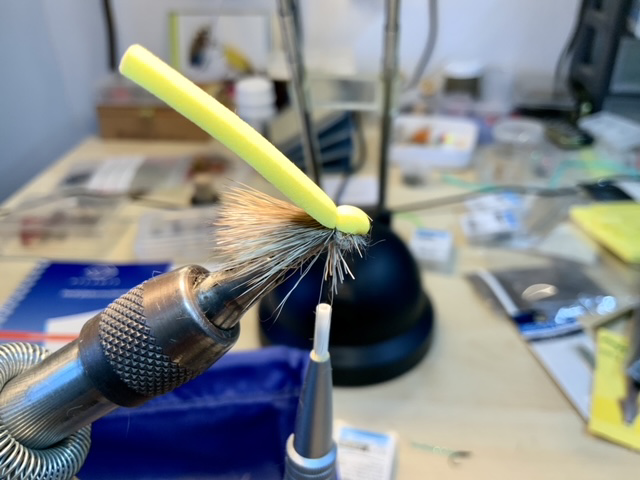 De dubbing onder het foamkopje werken we met een dubbingnaald ligt naar buiten om wat pootjes te suggereren.