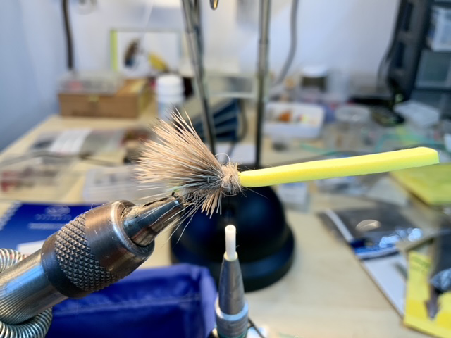 Vervolgens dubben we over het ingebonden puntje foam heel dun een paar slagen hazedubbing: