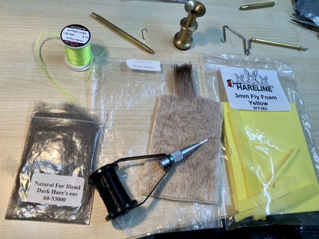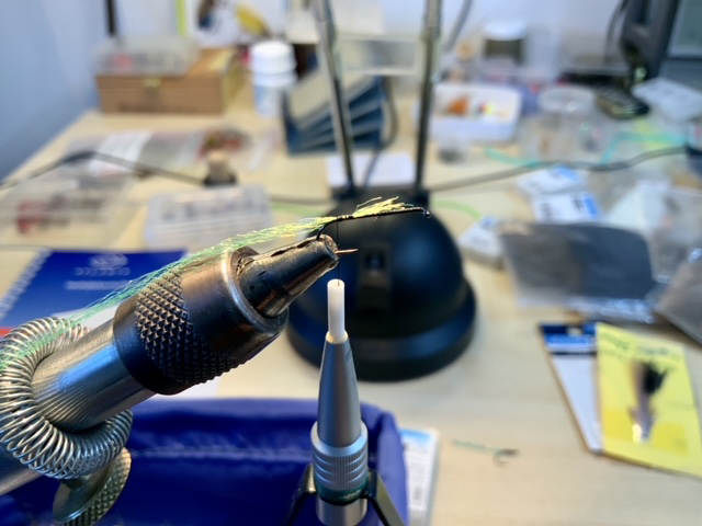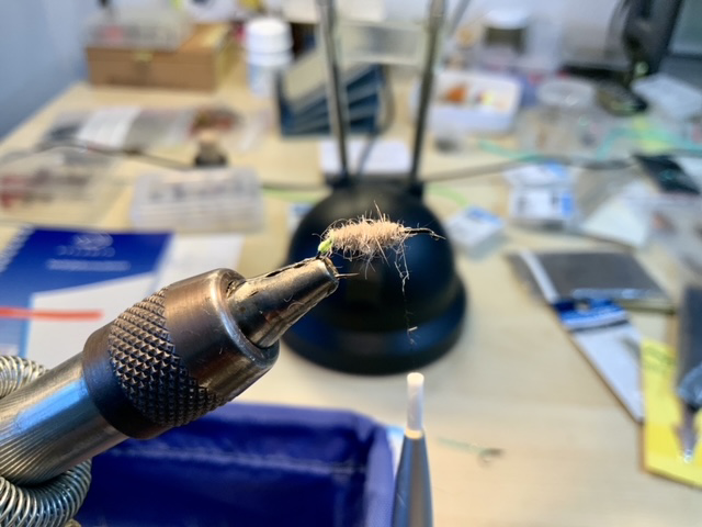 We knippen de Yarn cq binddraad af en wikkelen/dubben een plukje hazedubbing op de binddraad: