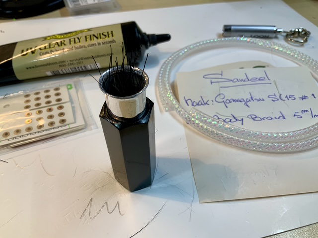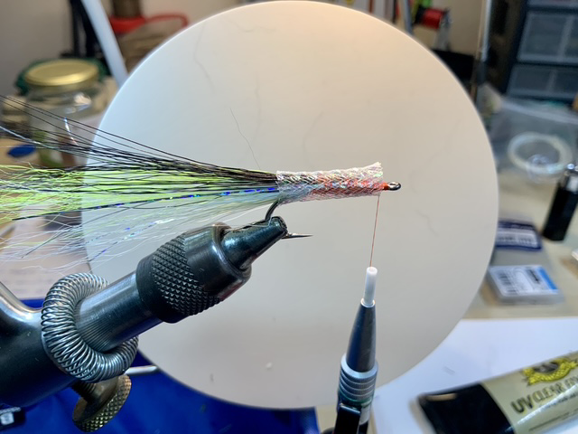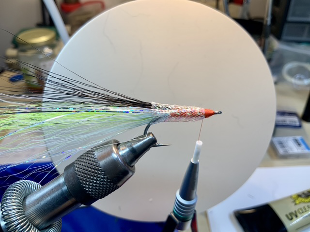 Als de drie bosjes ingebonden zijn kunnen we met een mini drupje secondelijm de bucktail extra zekeren.