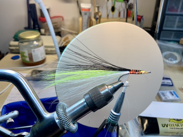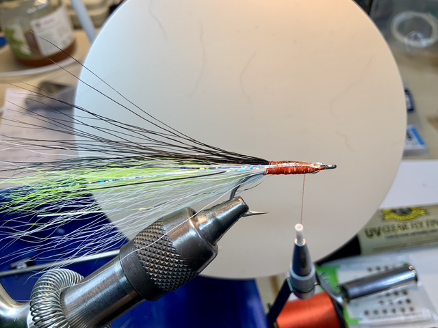Vervolgens doen we dit ook met het volgende bosje bucktail in de volgorde groen en zwart: