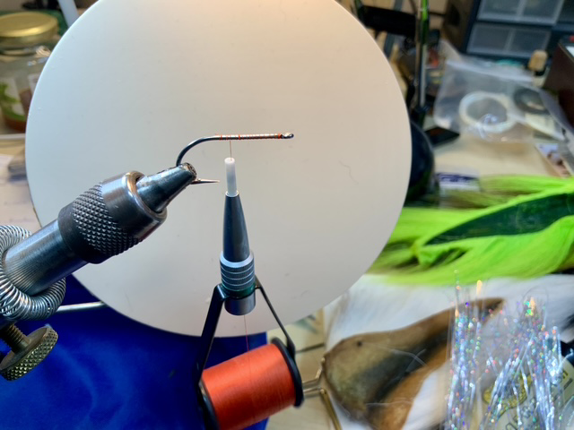 Vervolgens zetten we het binddraad weer op de haaksteel net achter het haakoog en binden de EZ-Body achter het haakoog vast en wikkelen gelijk een mooi rood kopje.
